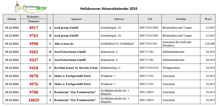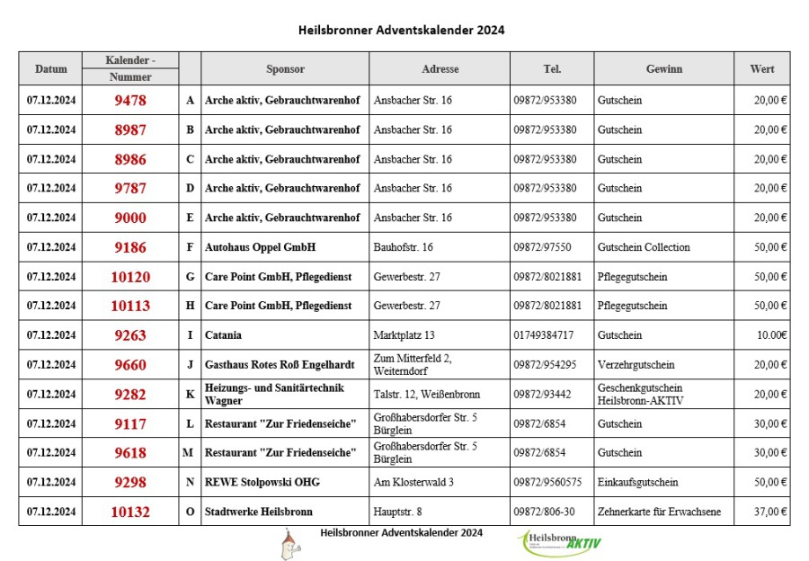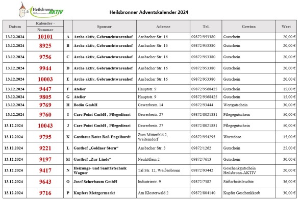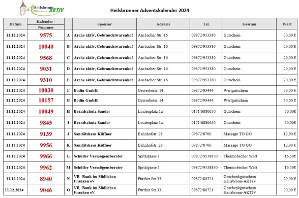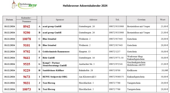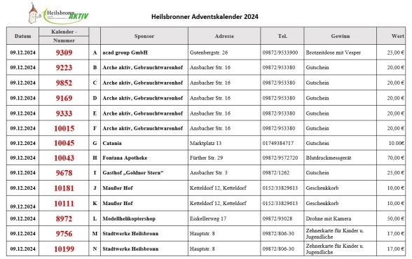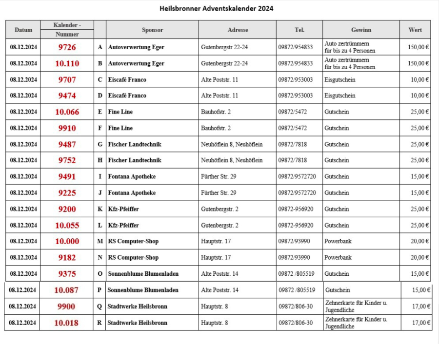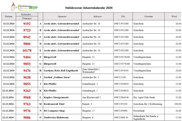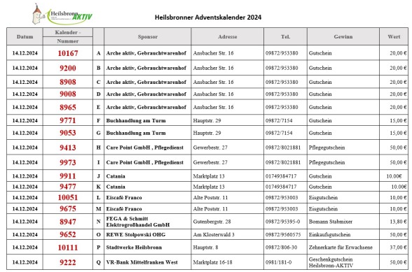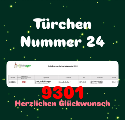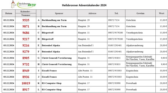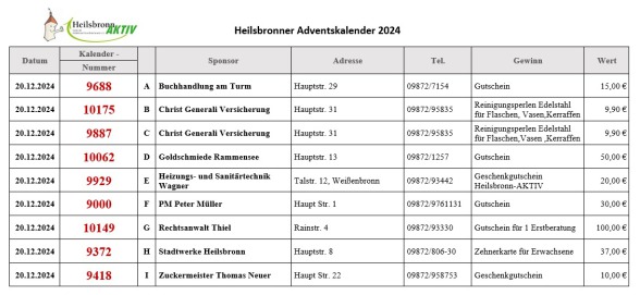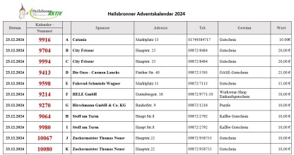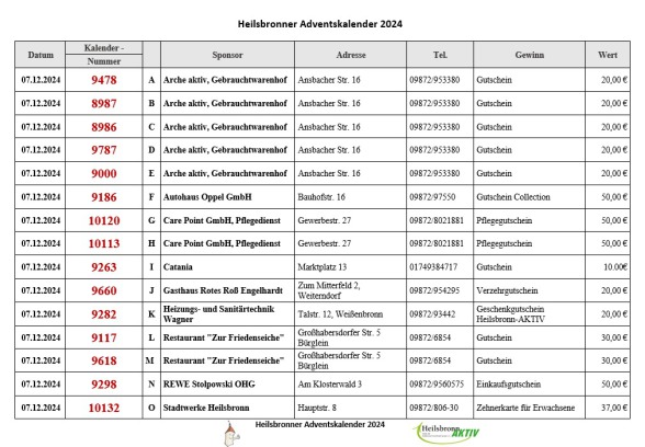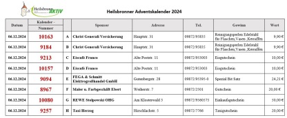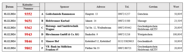 Wenn Sie mit Ihrer Losnummer gewonnen haben, können Sie Ihren Gewinn unter Vorlage des Adventskalenders in der hiesigen Firma abholen.