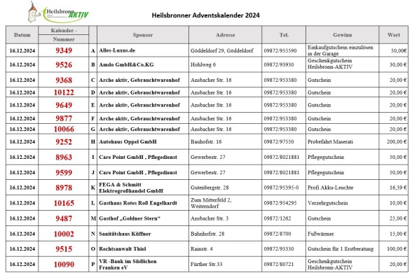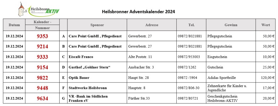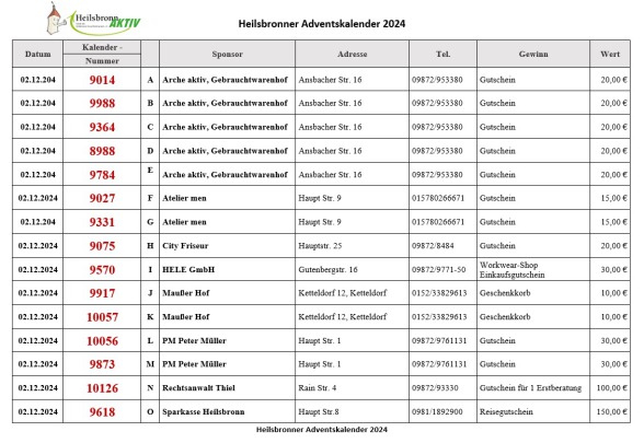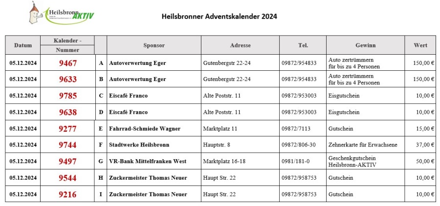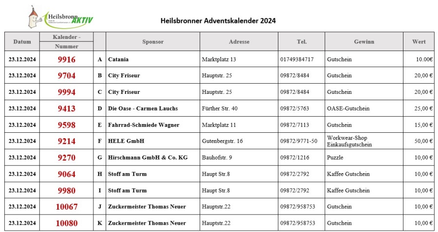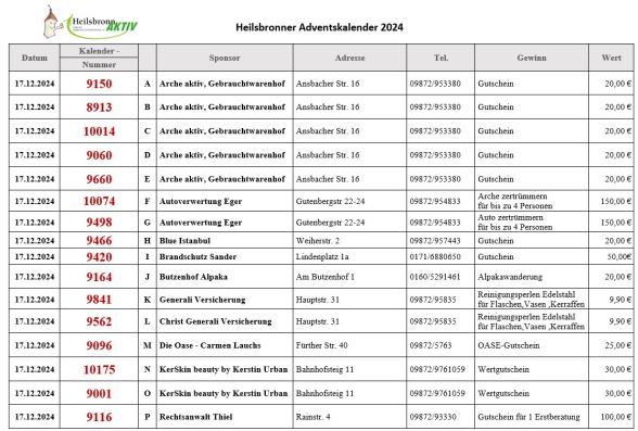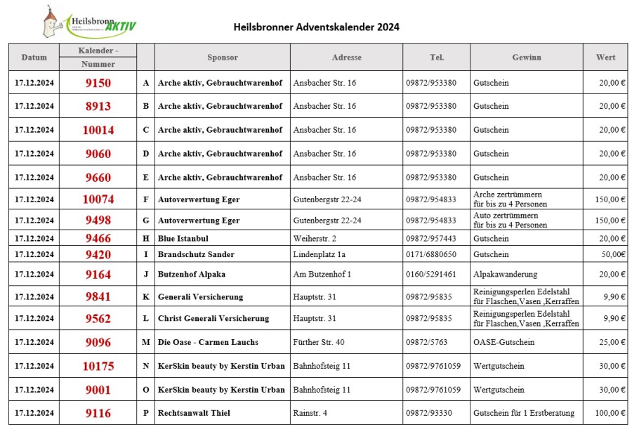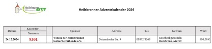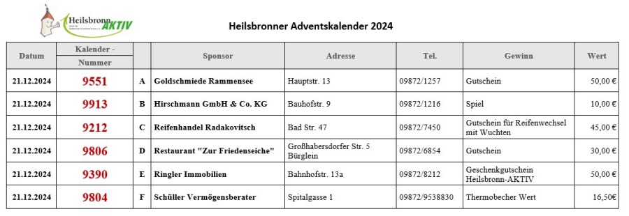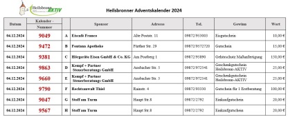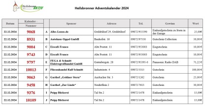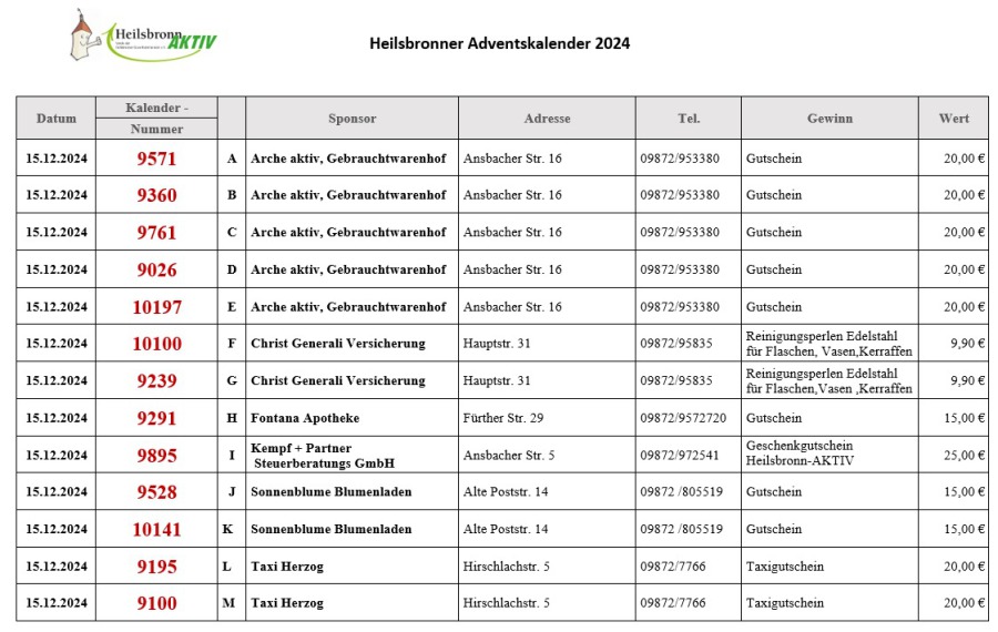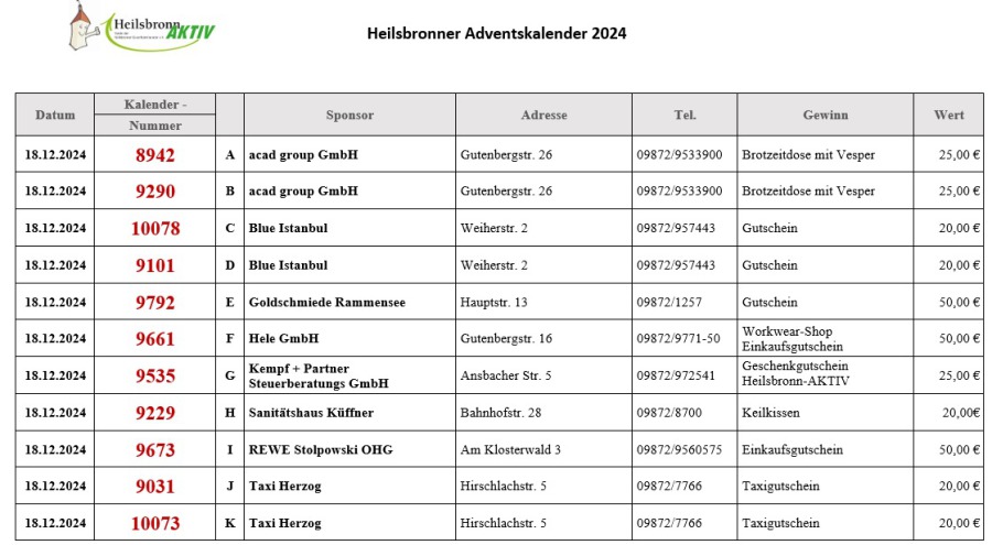 Wenn Sie mit Ihrer Losnummer gewonnen haben, können Sie Ihren Gewinn unter Vorlage des Adventskalenders in der hiesigen Firma abholen.