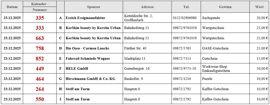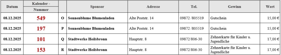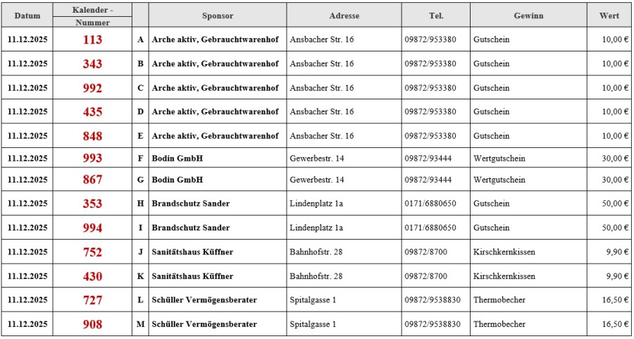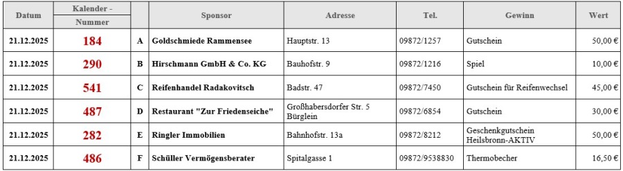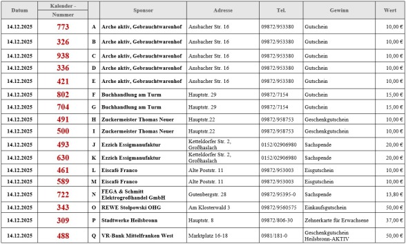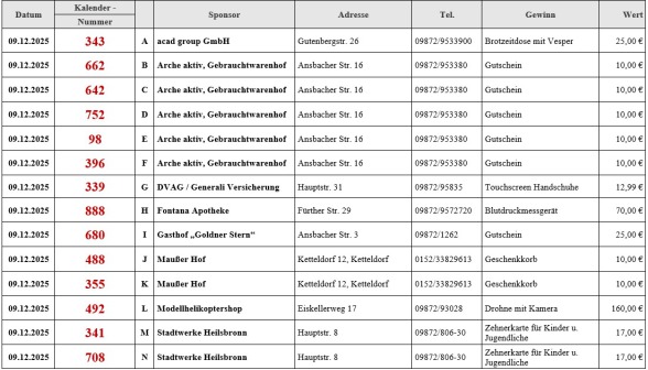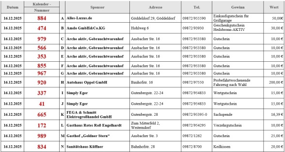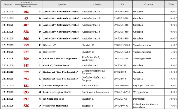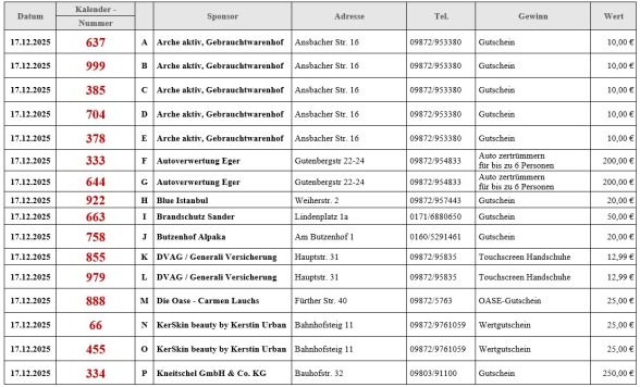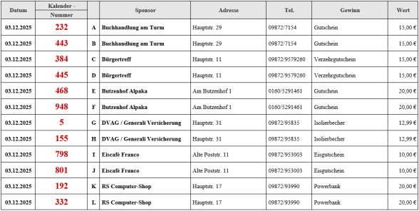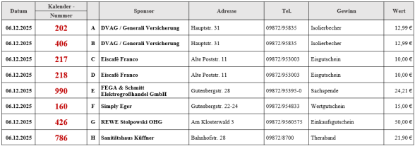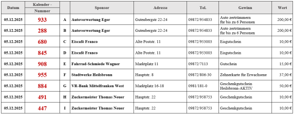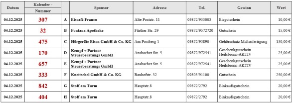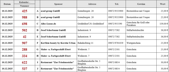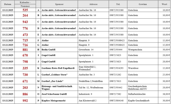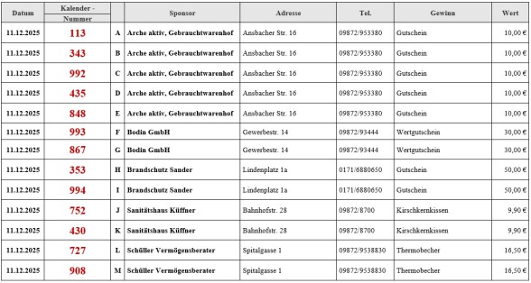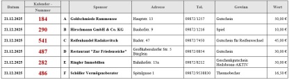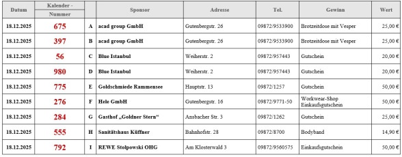 Wenn Sie mit Ihrer Losnummer gewonnen haben, können Sie Ihren Gewinn unter Vorlage des Adventskalenders in der hiesigen Firma abholen.