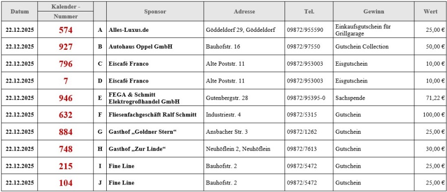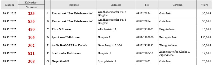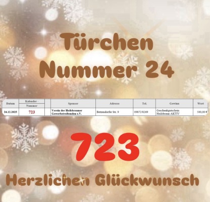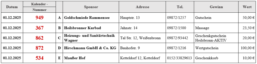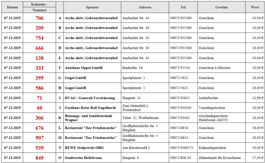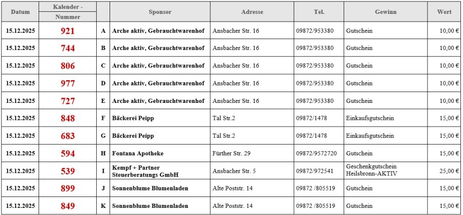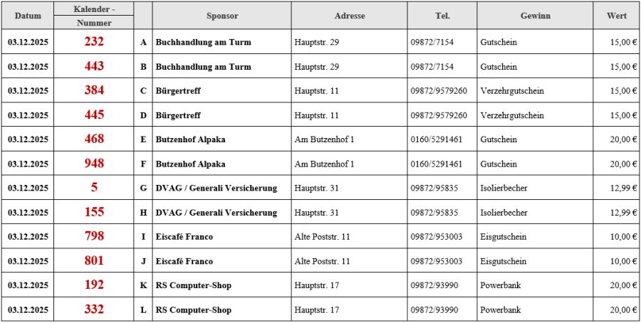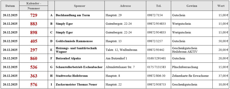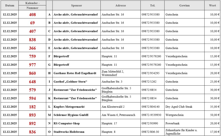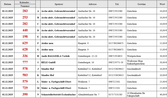 Wenn Sie mit Ihrer Losnummer gewonnen haben, können Sie Ihren Gewinn unter Vorlage des Adventskalenders in der hiesigen Firma abholen.