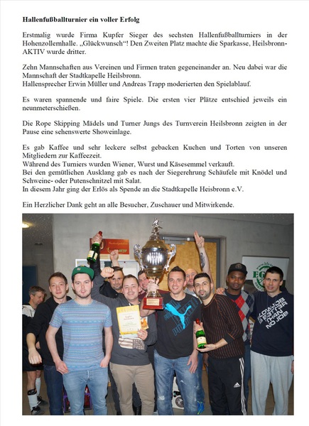 | Sa. | 27.01.2018 | 13:00 - 21:00 | Hohenzollernhalle | Hallenfussballturnier |