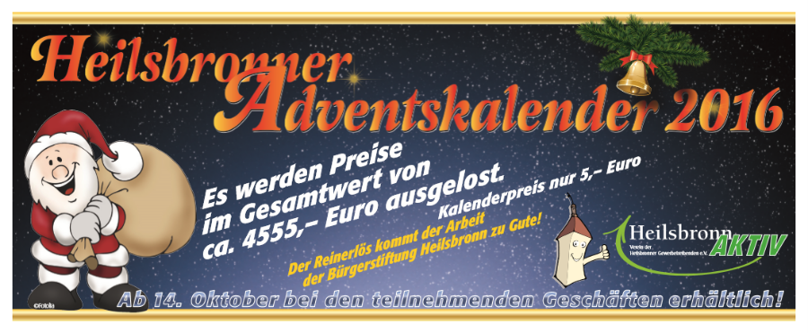 Der „Heilsbronner Adventskalender“ ist ab dem 14. Oktober 2016 für nur 5,00 € in den teilnehmenden Geschäften erhältlich. Hier mehr Info